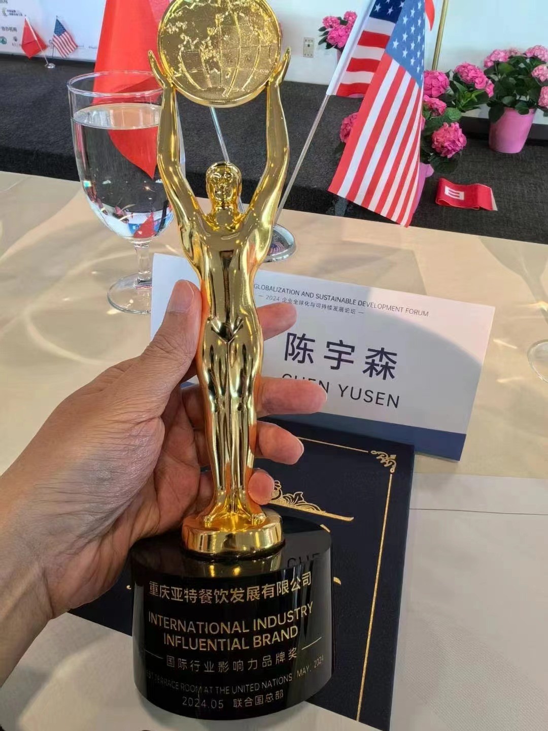 重庆火锅走向世界,亚特餐饮走进联合国。亚特餐饮总经理陈宇森携亚特餐饮参加《企业全球化与可持续发展论坛》。